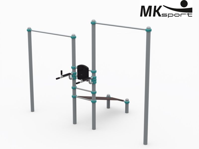 Воркаут-комплекс предназначен для тренировки мышц рук, спины, груди, плечевого пояса и пресса. Разноуровневые турники изготовлены из опорных столбов 89*3 мм и перекладин 32*3 мм. Спинка упора для пресса и отжиманий выполнена из пластика, материал подлокотников – пластик на круглой трубе 42*3 мм. Лавка для пресса изготовлена из толстой ламинированной фанеры. Для удобства выполнения упражнений наклонная скамья оборудована перекладиной для хвата. Стандартный цвет каркаса серый, хомуты стальные.